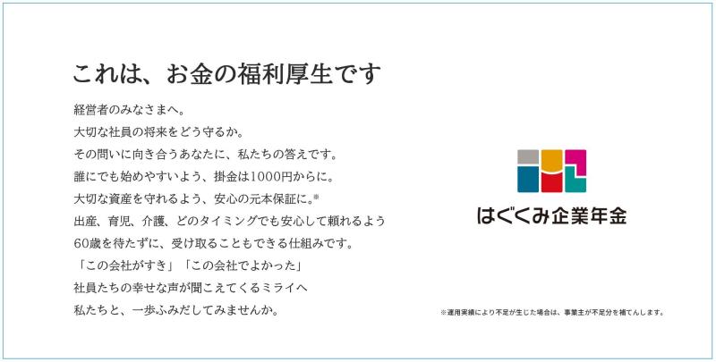 経営理念として「ビジネスを通じて、子育て世代と子どもたちが希望を持てる社会を作る。」を掲げ、確定給付企業年金である「はぐくみ企業年金」の導入推進から導入支援、各種サポート業務を行っています。 「はぐくみ企業年金」の導入によって人材定着・離職防止への効果が期待でき、特に人手不足が深刻化している中小企業や福祉業界において、従業員に安心して働いてもらうための「お金の福利厚生」としてご好評いただいています。