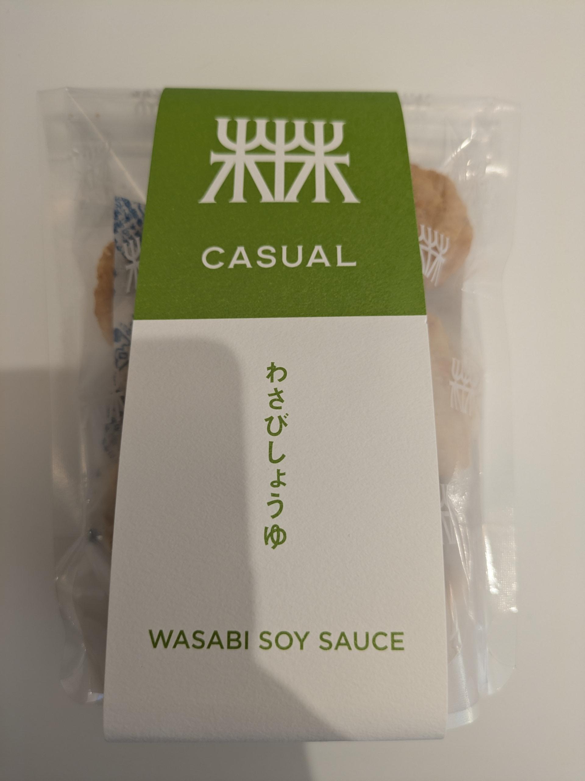 わさびしょうゆ 厳選した国内産うるち米100%使用し、玄米の米粒を残したお米の食感を味わえる生地に風味豊かなわさびしょうゆで仕上げました。 【商品の分類】 菓子/米菓 【内容量】 90g 【保存温度帯】 常温 【賞味期限】 製造日から150日 【業務用・小売用】 小売用 【希望小売価格】 500円(税抜)